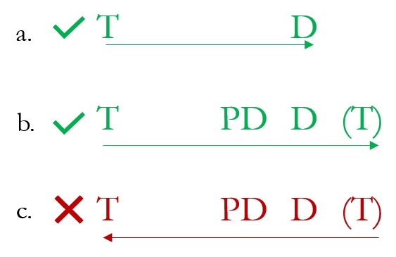 O modelo da frase é a orde típica do fluxo de funcións harmónicas dentro dunha frase. O esencial do modelo da frase é que ten que haber polo menos unha harmonía con función de tónica e outra con función de dominante para dar sensación de traxectoria. É habitual que as frases inclúan tamén unha harmonía con función pre-dominante para enfatizar esa sensación de traxectoria cara á conclusión. As frases case sempre progresan de esquerad a dereita neste modelo de frase, aínda que veremos algunhas excepcións máis adiante. Podes ver un resumo no Exemplo 1.